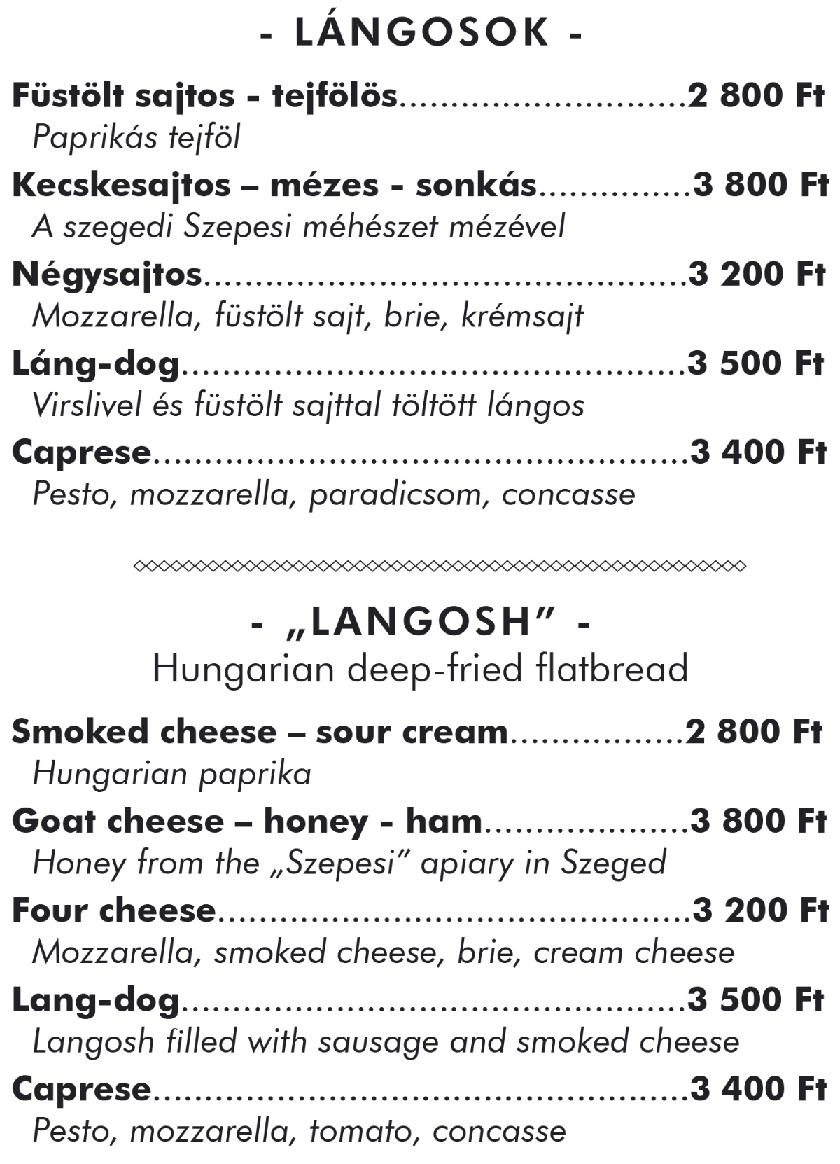 Nálunk a lángos több mint egy klasszikus fogás – igazi élmény. A klasszikus magyar alapokat megtartottuk, de a legjobb hazai alapanyagokkal és egy csipetnyi kreativitással emeltük új szintre. Ropogós, illatos tészta, tökéletesre sült szélek, és feltétek, amelyek nemcsak ízben, hanem látványban is különlegesek.